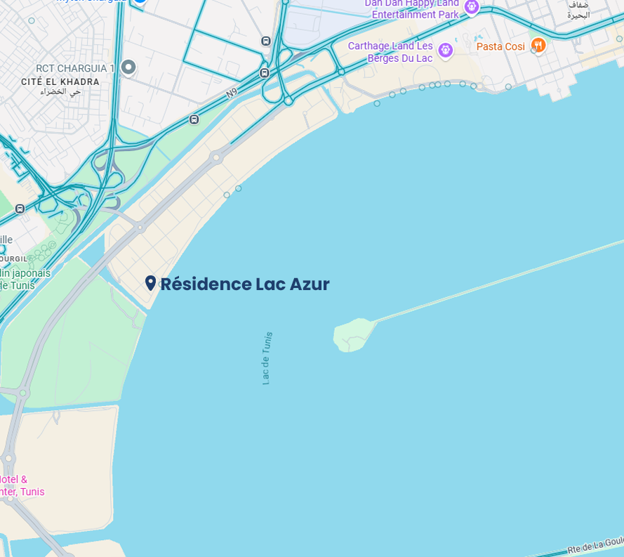 Située dans le secteur D de La Perle du Lac 1, directement au bord du lac, la résidence Lac Azur bénéficie d’un cadre privilégié à quelques minutes du centre-ville de Tunis et des berges du lac.